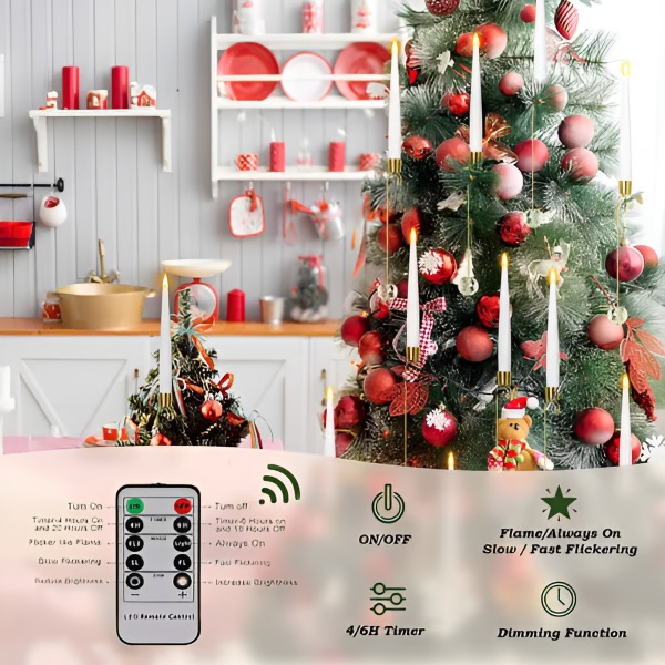 Ar 10 pogu tālvadības pulti var regulēt sveču spilgtumu, izvēlēties kādu no četriem gaismas režīmiem un iestatīt taimeri uz 4 vai 6 stundām, nodrošinot ērtību un elastību dekorēšanā.