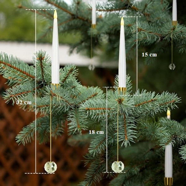 Šīs Ziemassvētku eglītes sveces ir aprīkotas ar zelta āķīšiem un caurspīdīgu kristāla bumbiņu dizainu, kas dabiski saplūst ar eglītes zariem, radot elegantu un svinīgu izskatu.