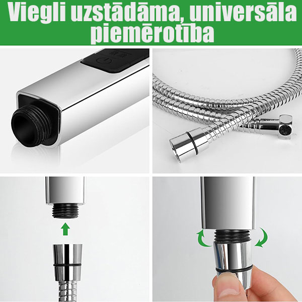 Piemērota jebkurai standarta šļūtenei sekundēs—bez instrumentiem, bez problēmām. Inovatīvi silikona sprauslas novērš kaļķakmens uzkrāšanos, saglabājot ūdens plūsmu spēcīgu un stabilu.