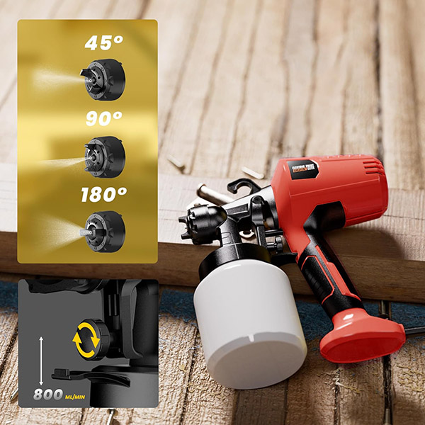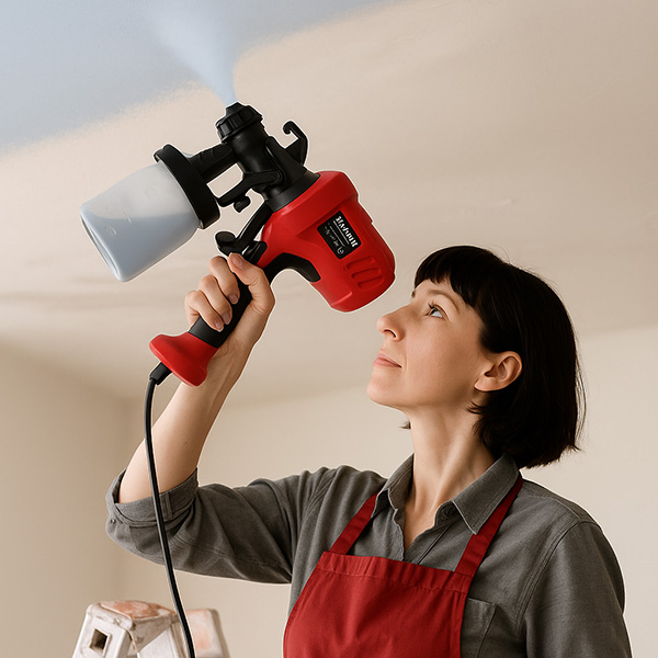 Īpašā sprausla rada smalku krāsas miglu, kas nosēžas vienmērīgi, bez svītrām vai pleķiem. Instruments rada sajūtu, ka katra zona nokrāsojas pati “tā, kā vajag”, neatkarīgi no materiāla, lietotāja pieredzes vai kustības virziena.