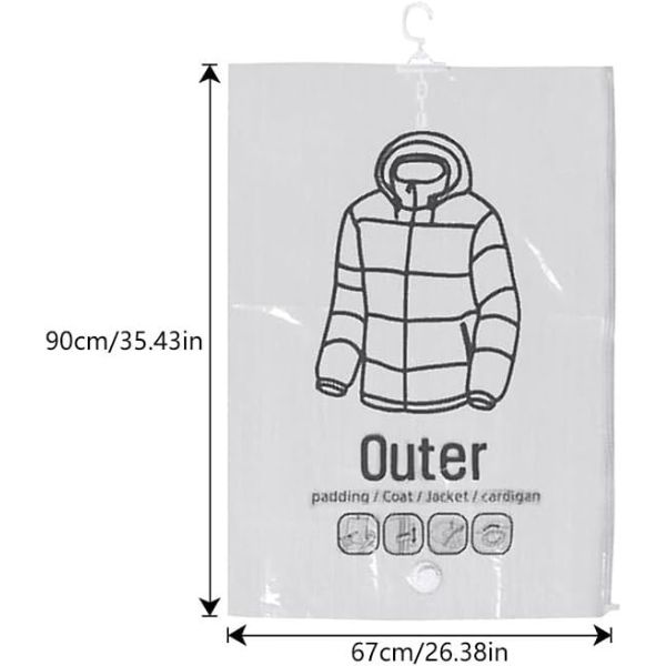 Maksimāli palieliniet savu garderobes telpu, saglabājot tajā kārtību visos gadalaikos. Izmantojiet šos piekaramos saspiežamos maisus lielu, lielgabarīta vai novecojušu uzvalku, kleitu, biezu vestu, jaku un mēteļu glabāšanai savā skapī. Mūsu vakuumizturīgie uzglabāšanas maisi pasargā jūsu apģērbu no ūdens un smakām, padarot tos ideāli piemērotus ilgtermiņa lietošanai.