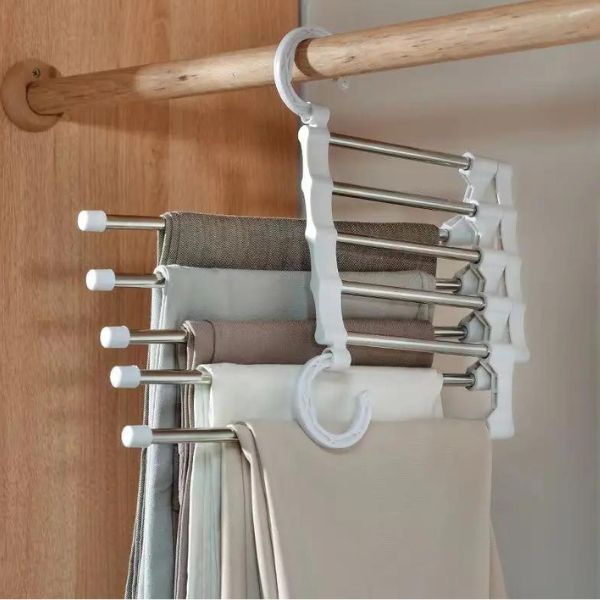 Saskaņojiet savu garderobi un baudiet perfektu kārtību. Nodrošiniet, lai jūsu drēbes vienmēr būtu kārtībā un sasniedzamas ar mūsu daudzpusīgo 5 ātrumu bikšu pakaramo!