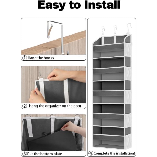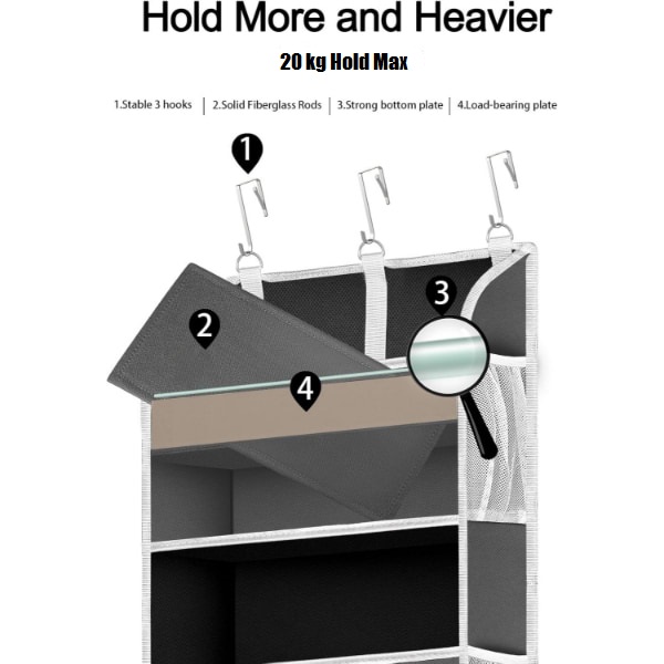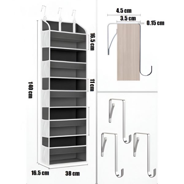 Aprīkots ar 3 regulējamiem metāla āķiem, šis organizators viegli piestāv durvīm līdz 4 cm biezumam.