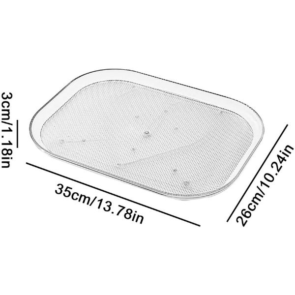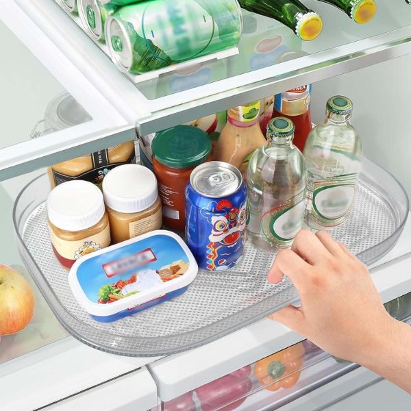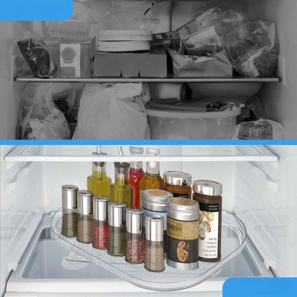 Uzturiet savu ledusskapi kārtīgu un tīru, izmantojot mūsu caurspīdīgo taisnstūrveida ledusskapja paplāti. Šis 360° rotējošais ledusskapja organizators ir ideāli piemērots ērtai piekļuvei un maksimālai vietas izmantošanai. Tas ir viegli tīrāms, tam ir neslīdošas piesūceknes, un tas nav jāuzstāda.