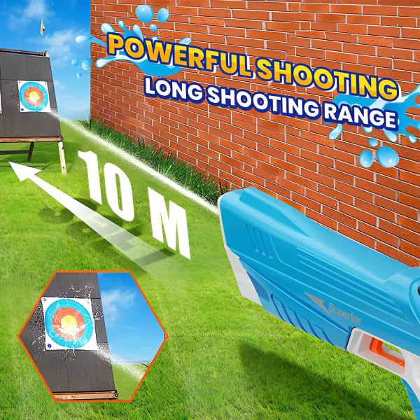 aptuveni 8-10 metri (ūdens pistoli nedrīkst iegremdēt ūdenī)